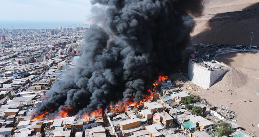 Al menos 100 viviendas resultaron consumidas por las llamas y 400 personas quedaron sin techo este lunes durante un incendio que afectó al campamento irregular de Laguna Verde ubicado en la ciudad de Iquique, al norte de Chile.