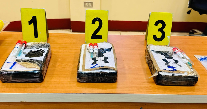 Durante la requisa, en una caja de cartón que portaban, se encontraron tres paquetes envueltos en cinta adhesiva que contenían la droga. La prueba de campo confirmó que la sustancia era cocaína. También se incautaron dos teléfonos celulares, que serán utilizados como evidencia en la investigación.